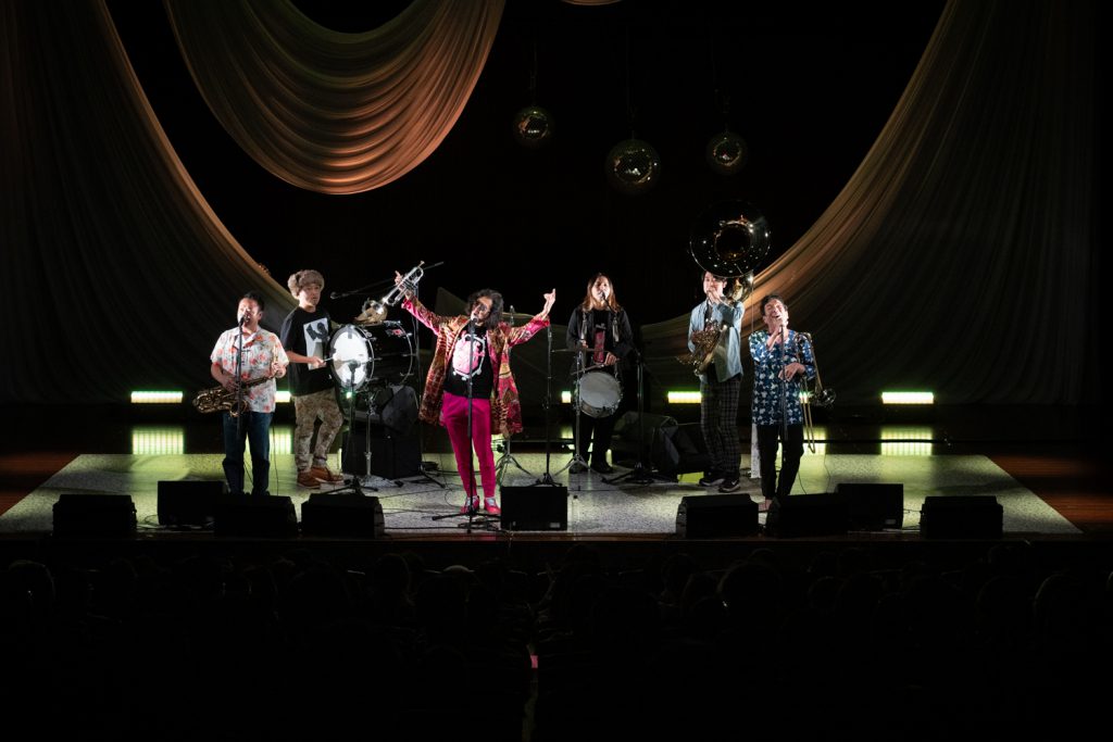 暗転したステージを注視していると、客席通路の後方からマーチングが突然鳴り響きます。メンバーの登場です。ステージに上がり、そのまま2曲目の「Orange Peel」へ。ベースドラムANTONさん、スネアドラムSEIYAさん、そしてスーザフォンのTAMOTSUさんのリズム・トリオと、YUTA919さんのトランペット、サックスのIGGYさん、トロンボーンのYASSYさんの管楽器トリオから発せられる音が、心と体を揺らす波のように押し寄せます。客席からは早くも手拍子が聞こえてきます。