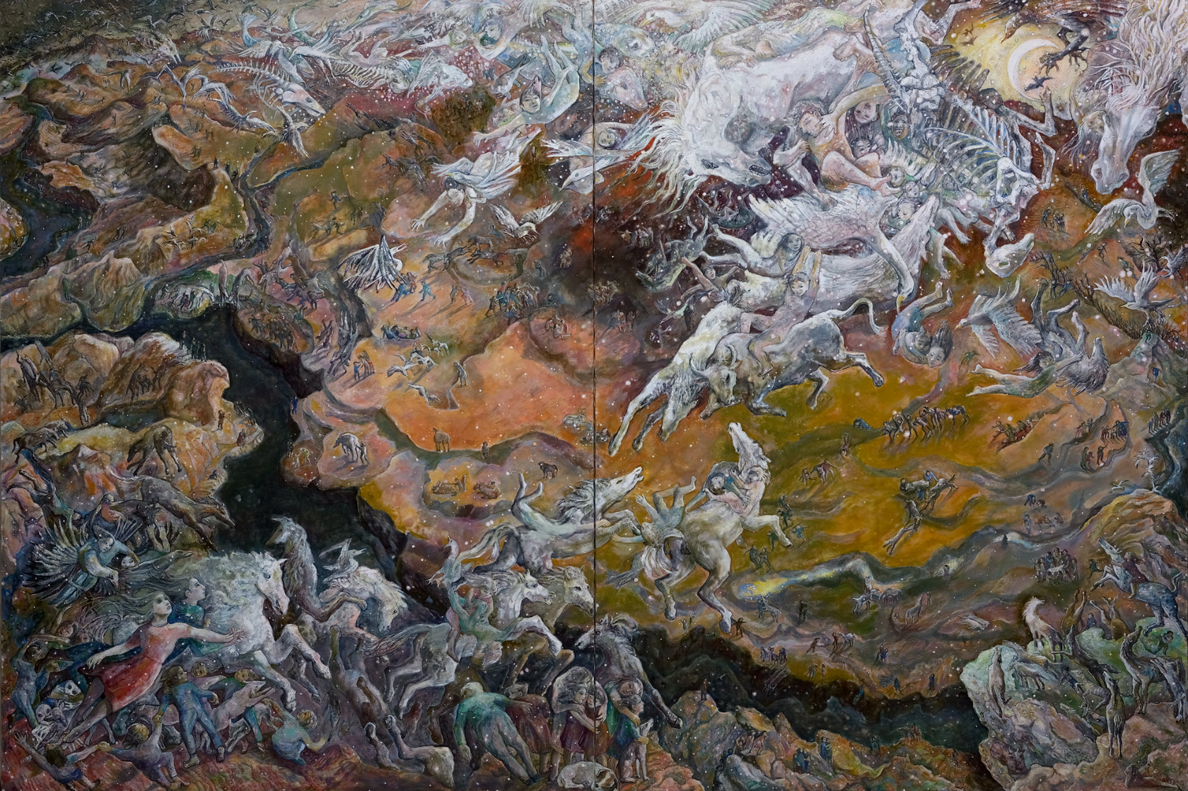 本展では、遠藤彰子の創作の起点となった「楽園」シリーズ、画家として名を世に知らしめた「街」シリーズ、30年以上にわたり今も挑み続ける500号を超える「大作」シリーズと、2022年の最新作《山鳴りひびく》を含めた代表作約60点の絵画作品を変遷を追いながら一挙ご紹介いたします。