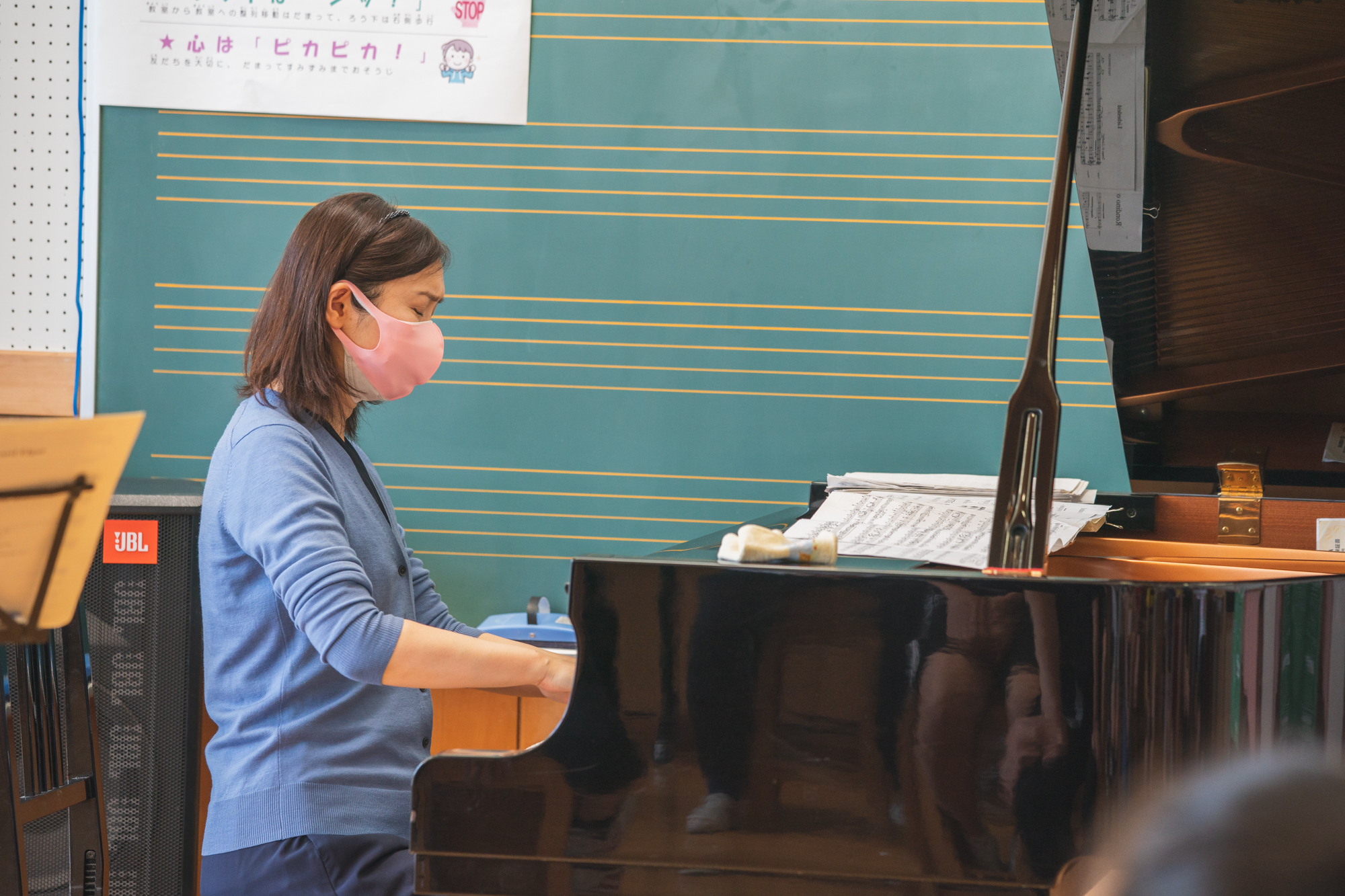 演奏したのは、愛らしい子犬の情景が浮かんでくる楽しい曲「子犬のワルツ」。前方に座っている子どもたちは、鍵盤の上を軽やかに舞う高橋さんの手元にじっと見入っていました。