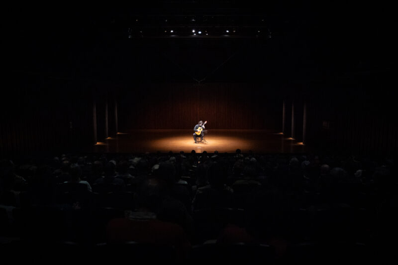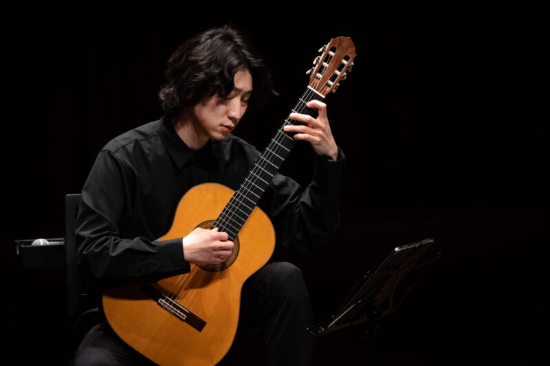 徳永さんはギターを捧げるように一礼して演奏をはじめます。ロマン派を代表するメルツの作品は当時流行した人気オペラの変奏曲。19世紀古典期のカルッリの作品は温かく耳なじみよく響きます。ユニークなタイトルの3曲目はドイツ民謡の素朴さの中に、ギターの華やかさと技巧が光ります。そして4曲目は、ショパンのマズルカを同郷ポーランドのギタリスト・ボブロヴィッツが編曲した作品。原曲に感じる冬の日差しのような温かくもどこか漂う哀感が、ギターによってより増すようでした。前半最後は情熱的なハンガリー幻想曲で超絶技巧が冴えます。
