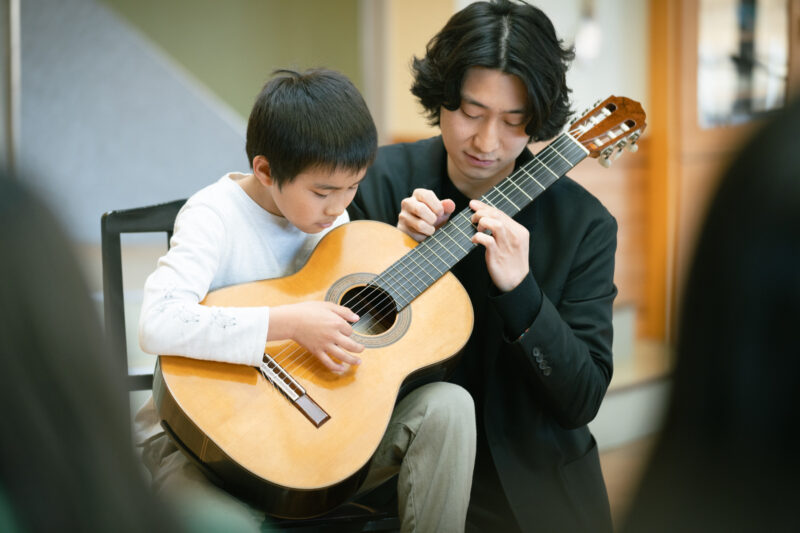 ここで、徳永さんから「弾いてみたい人はいますか?」と思いがけない提案が。立候補した男の子が右手で3弦を繰り返し弾いて、徳永さんが弦を押さえていくと……映画『禁じられた遊び』のテーマ曲です。最後、男の子が「ジャン!」とかっこよく弦を鳴らしました。もうひとり弾いてみた男の子は、弾くと体にギターの振動が伝わって「震える感じがします」と驚いていたようでした。5曲目は先ほどの『禁じられた遊び』のテーマ『愛のロマンス』。徳永さんの演奏が、耳慣れた曲に新鮮な美しさを吹きこんでいました。