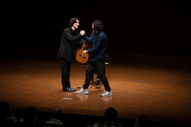後半1曲目、プーランクの作品はラストの開放弦が印象的でした。2曲目は20世紀最高のギタリスト、セゴビアに捧げられた曲。続く『暁の鐘』はトレモロの美しさが際立ちます。最後は、スペイン内戦で命を落としたホセの『ソナタ』です。「今回の公演が決まった時に、最初に選んだ曲です」と徳永さん。約20分、より深い集中で徳永さんは演奏に没頭します。アンコールでは、学校でのアウトリーチのためにギタリスト大坪純平さんに依頼した新作をリサイタル初演します。宇宙を感じる音色、トレモロ、ハーモニクス、弦やボディを叩くスラム奏法など、目に耳にギターの魅力を訴えかけてきます。拍手に押されるように大坪さんがステージに上がり、徳永さんと抱き合います。アンコール2曲目は興奮を慰撫するような『エストレリータ』でした。