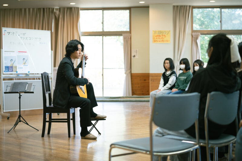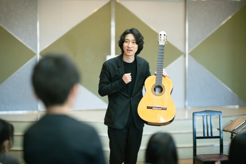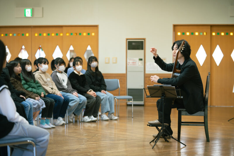クラシックギター奏者の徳永真一郎さんは2025年度のレジデント・アーティストのおひとりです。塩田西小学校5年生のクラスコンサートの模様を取材しました。