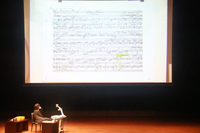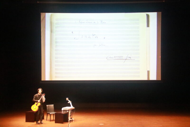 今回解説したのは、「今回のリサイタルでまず演奏したいと思いました」と語るA.ホセの大曲「ソナタ」。彼が生涯でたった二つだけ残したギター曲の一つです。自筆譜をモニターに映し、徳永さんが演奏した音源を聴きながら曲の構成をたどりました。