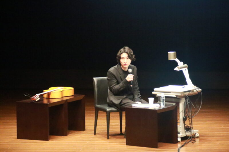 レジデンスアーティストとして、上田市内の小学校でクラスコンサートを行ってきた徳永真一郎さんによるアナリーゼ。登場するや「コンサートより緊張しています」と話し、会場を笑いで包みました。