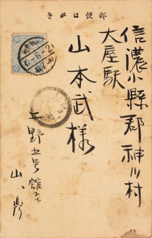 例えばこの絵はがきは、鼎が明治37年に鼎が上田に住む母親・武(たけ)に宛てたものです。