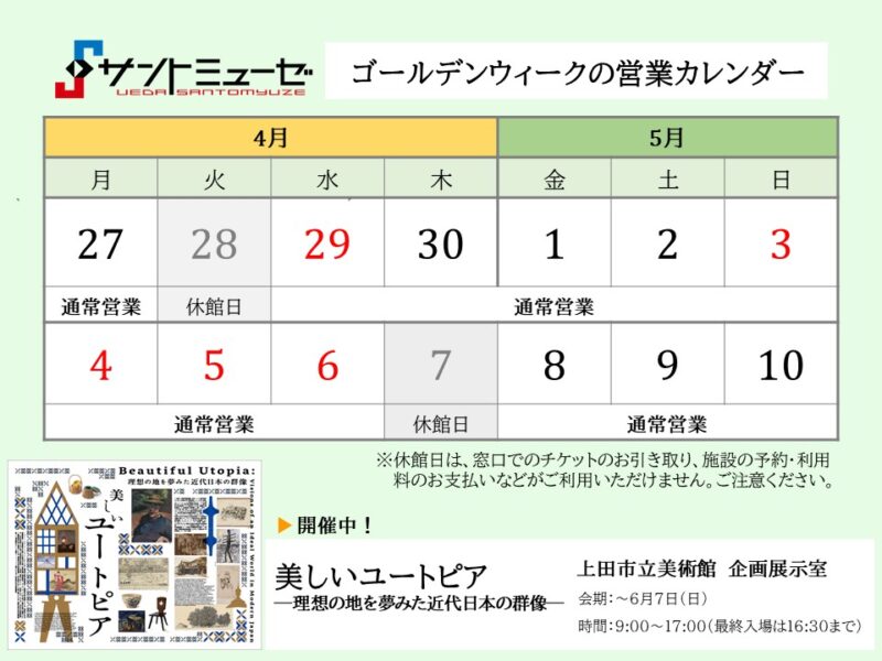 ゴールデンウィークは上田市交流文化芸術センター・上田市立美術館ともに、下記の日程で営業いたします。