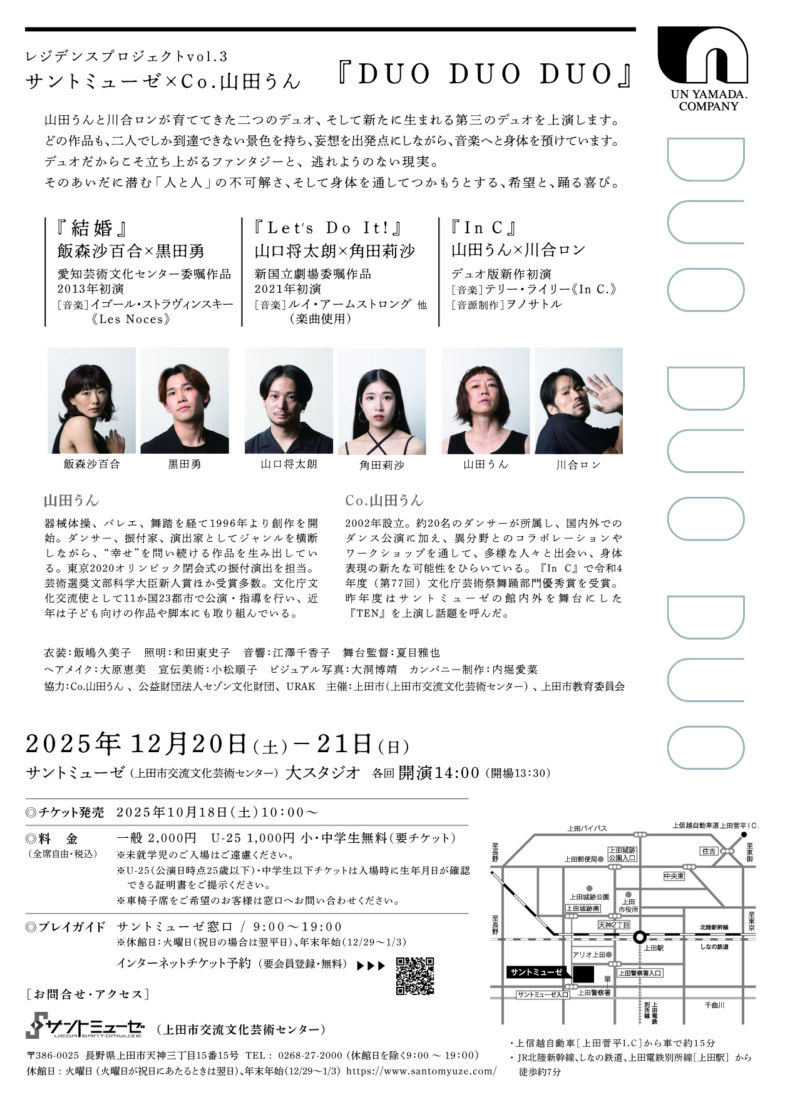 山田うんと川合ロンが育ててきた二つのデュオ、そして新たに生まれる第三のデュオを上演します。