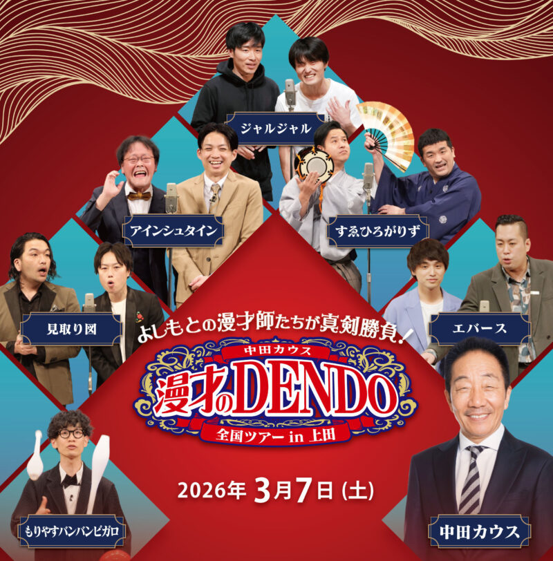 「漫才のDENDO」はよしもとが厳選した漫才師たちが繰り広げる本格漫才寄席です。よしもとが育んできたお笑い芸能「漫才」は、横山エンタツ・花菱アチャコが創り出し、その話芸はどの時代も、劇場にご来場くださったお客様の笑顔と共に発展してきました。
