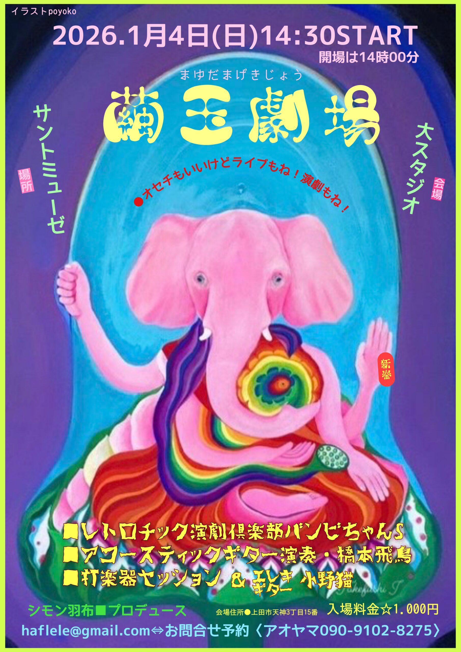 概要 日時 令和8年1月4日(日)開演14:30(開場14:00) 料金 1,000円 会場 サントミューゼ 大スタジオ お問い合わせ 繭玉劇場 090-9102-8275/haflele@gmail.com SHARE