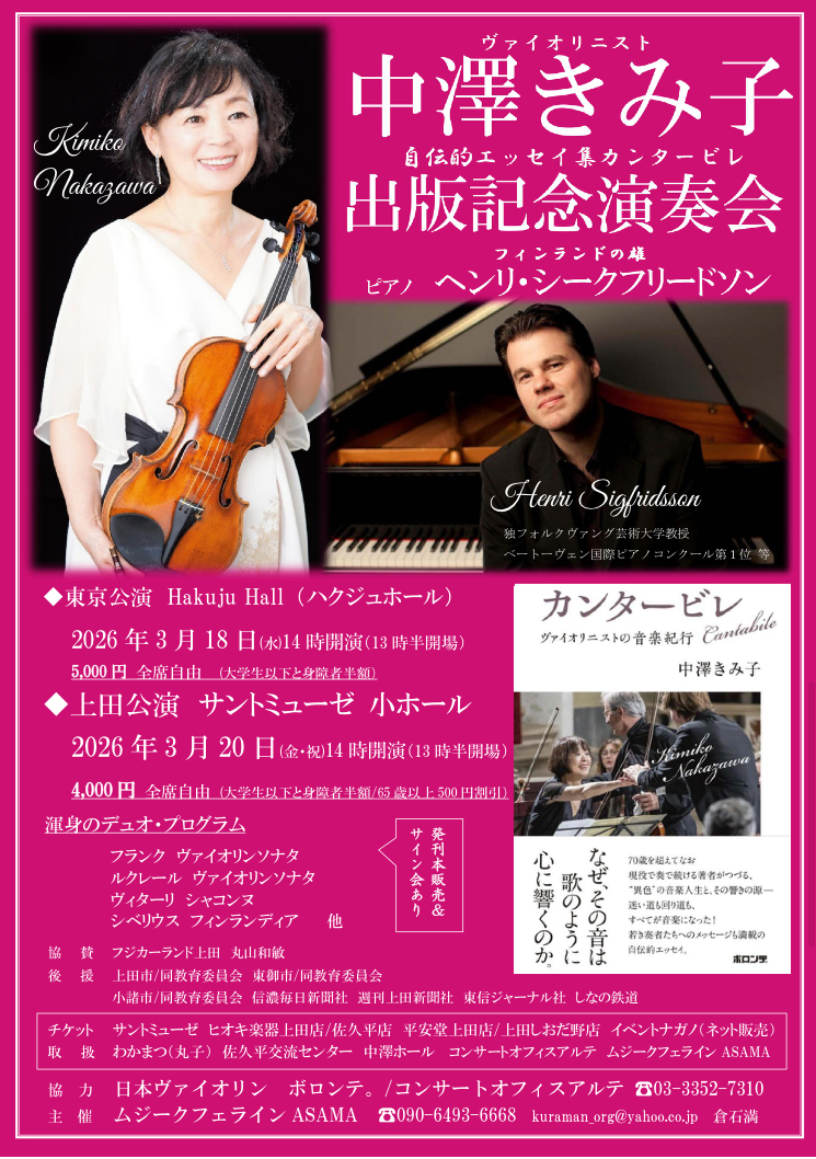 概要 日時 令和8年3月20日(金・祝)開演14:00(開場13:30) 料金 4,000円 ※サントミューゼ取り扱い分のチケットは、公演前日19時まで窓口で販売(現金のみ) 会場 サントミューゼ 小ホール フライヤー お問い合わせ ムジークフェラインASAMA 090-6493-6668(倉石) SHARE