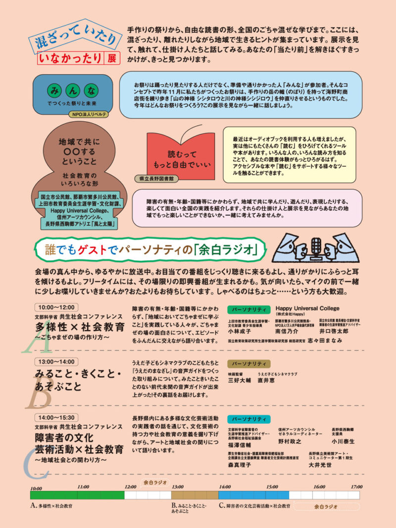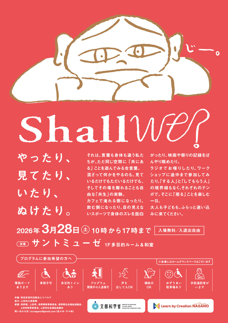 概要 日時 令和8年3月28日(土)10:00~17:00 料金 無料/入退出自由 会場 サントミューゼ 多目的ルーム・和室 プログラム お問い合わせ 文部科学省、Learn by Creation NAGANO実行委員会 lxcnagano@gmail.com(佐々木・千々和) SHARE