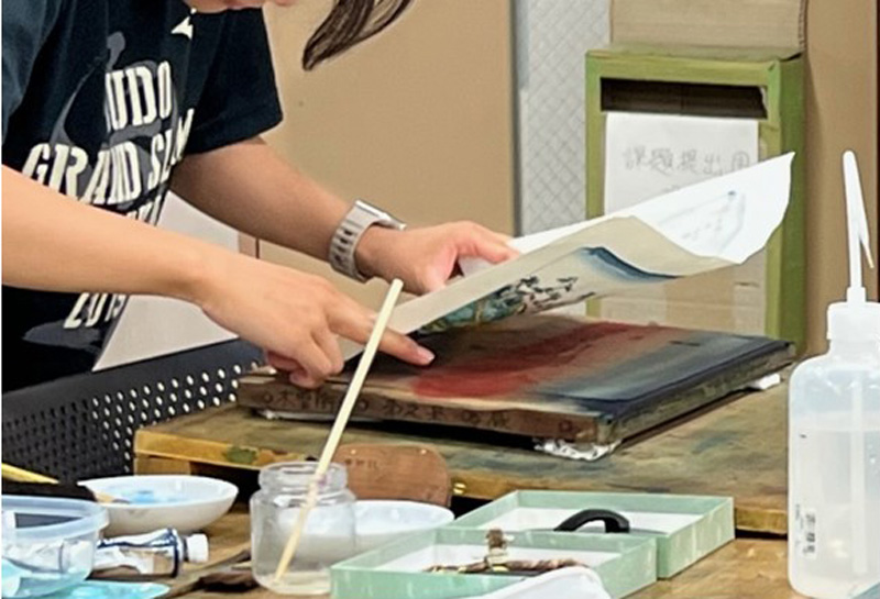 「木曾海道六十九次」の復刻版木を用いて多色摺りを体験する講座です。浮世絵に用いられている伝統的な技法や色の重なりによって一枚の作品が完成するまでの様子を楽しみましょう。