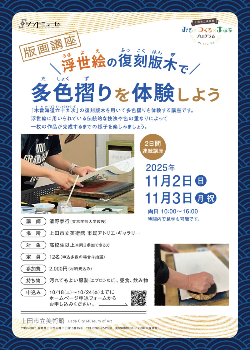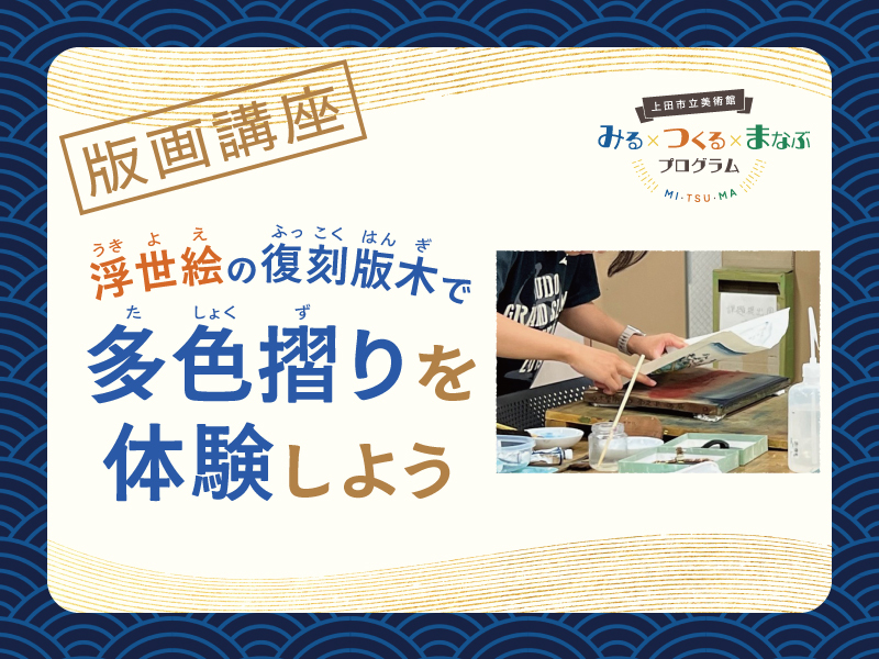 「木曾海道六十九次」の復刻版木を用いて多色摺りを体験する講座です。浮世絵に用いられている伝統的な技法や色の重なりによって一枚の作品が完成するまでの様子を楽しみましょう。