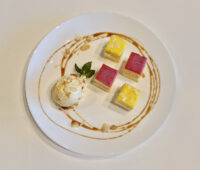 苺とレモンのケーキにバニラアイスとキャラメルソースの彩りをのせた一皿です。